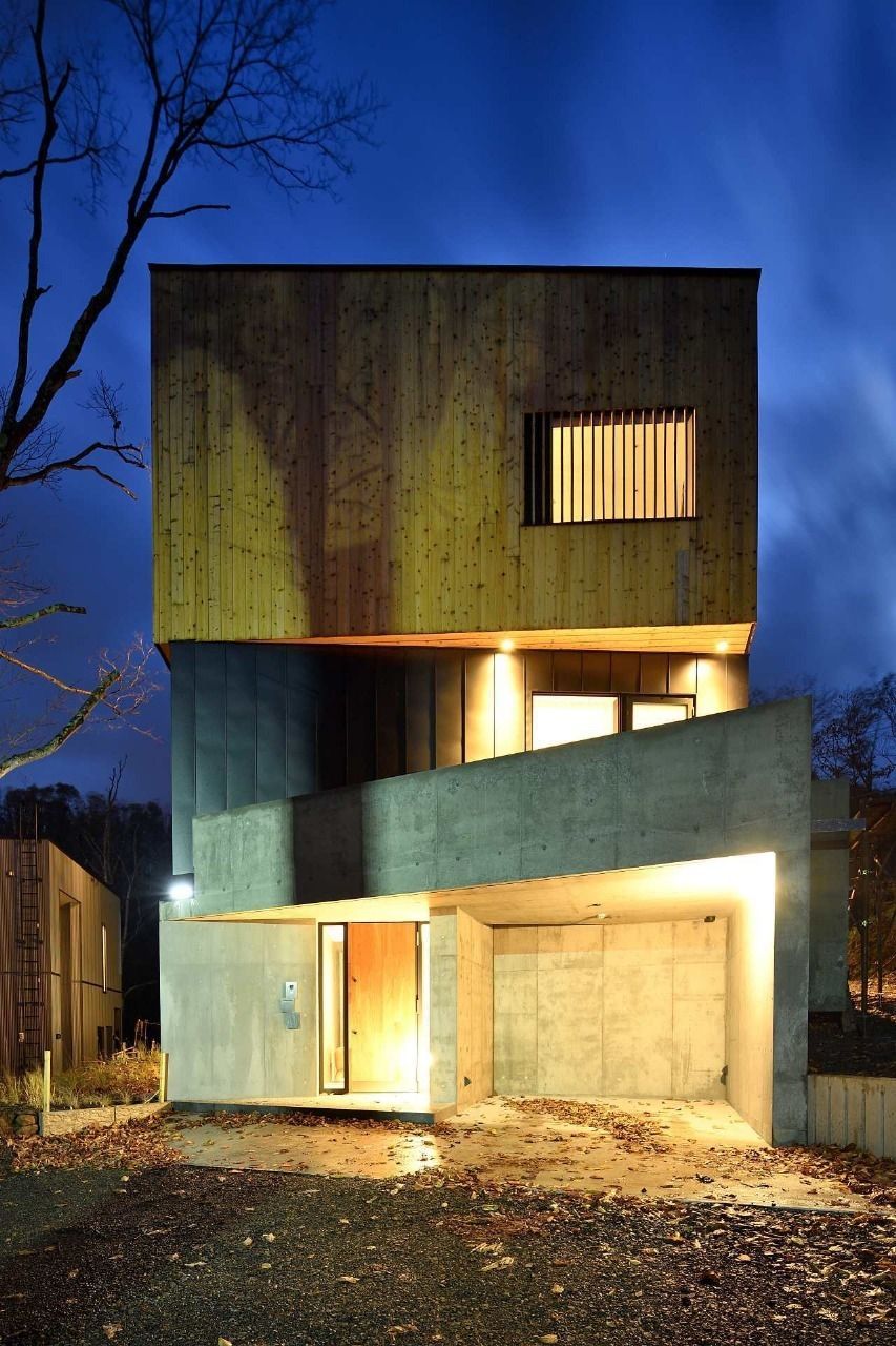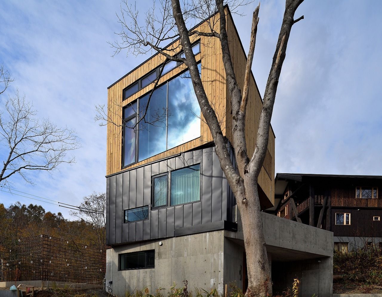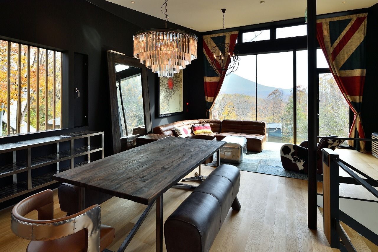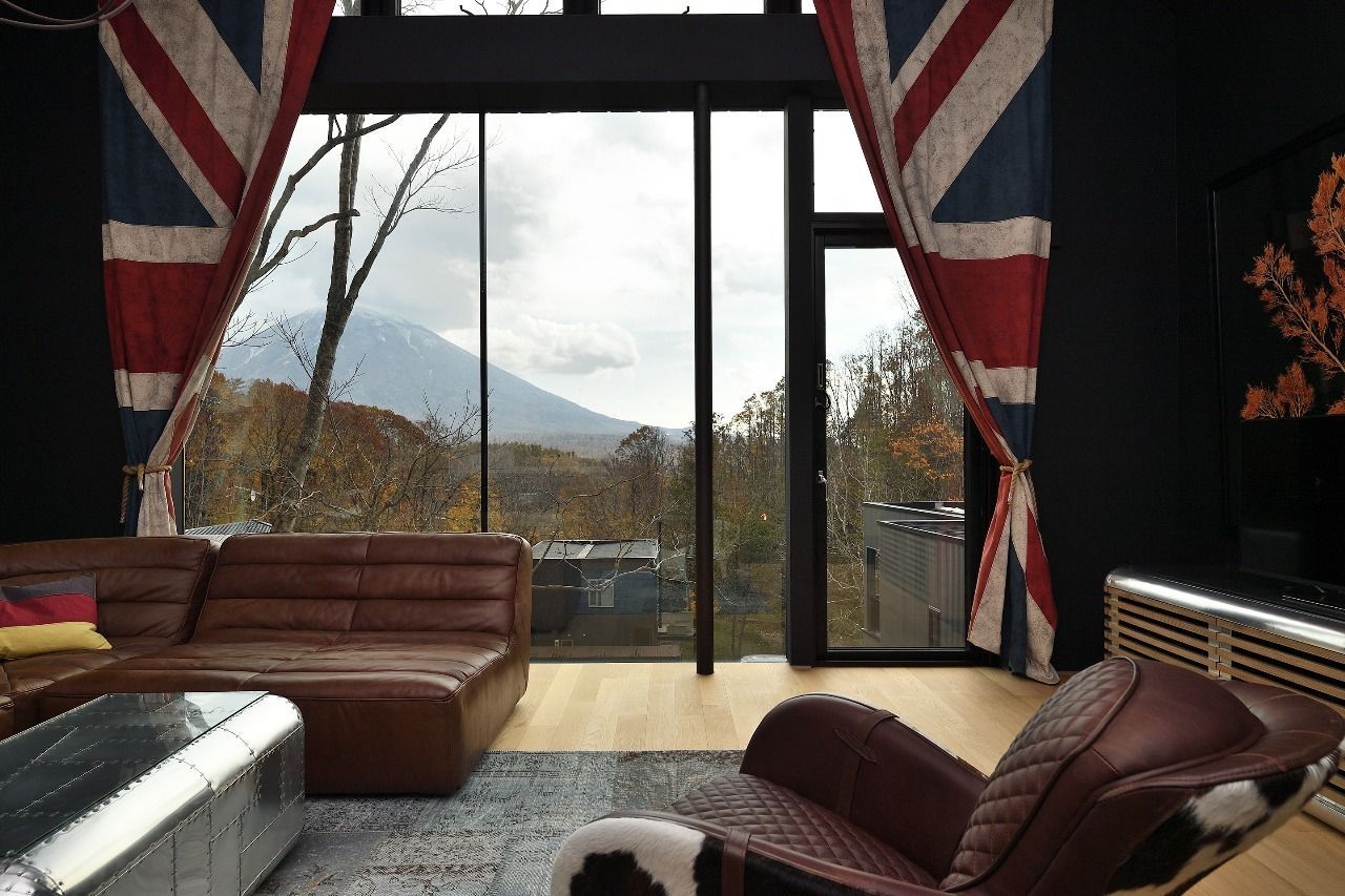 Expansive windows look out toward Mount Yotei and surrounding forest.